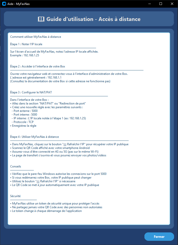Contrôle Total de l'Accès : Pour utiliser l'application à distance (en dehors de chez vous), il vous suffit de configurer une règle NAT/PAT sur le port 5000 de votre Box internet. C'est vous qui ouvrez la porte de votre propre serveur personnel.